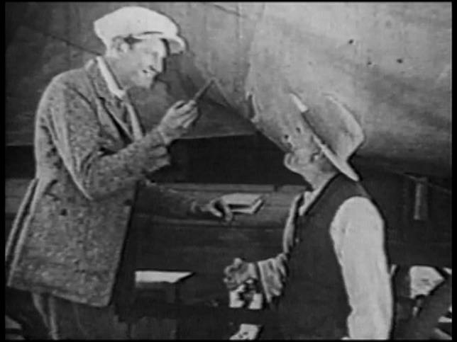 In Two Wagons, Rogers essays both Banion and Jackson. But he does so in a mock-heroic fashion, satirizing Cruze’s wily pairing at their most sententious. Jackson is shown to be able to identify the Mississippi by smell alone, extending the cliché of the all-knowing scout beyond any reasonable credulity. For his part, “Will Bunian” appears as an Eastern dandy touristically living out his pioneering fantasies, akin to the cowboy-obsessed “dude” of earlier Western comedies, including Fairbanks’ Wild and Woolly. The overall impression throughout the short is that of men indulging in a fantasy, of frontier grandstanding detached from the tenacity and reality of the living West. The chivalric constancy and lack of imposing physiognomy offered by Kerrigan’s Banion—compared to most Western heroes, at least—is translated into effeminacy and ineptitude. Rogers’ portrayal appropriates the ex-army major’s dimensions and maps them onto the head of the “Palm Beach boys.”