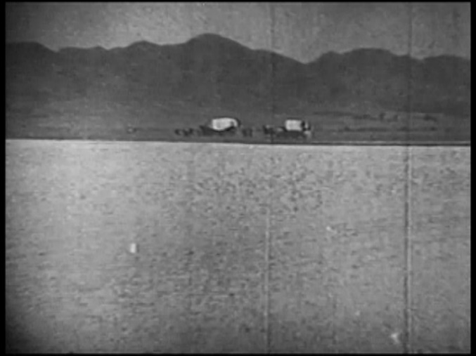 Despite sharing many of its inspiration’s basic semantic elements, Two Wagons differentiates itself via deficiency and discontinuity, eschewing authority in favor of critical distance. This can be seen in its treatment of The Covered Wagon’s most commented-upon motif – the eponymous wagon train’s continual movement across the landscape, right to left (Fig. 3) – a spectacle of mass migration and expansion that some observers felt best demonstrated the inherent affinity between American history and the motion picture: the progress of the nation could be graphically figured, as a dynamic of geographical penetration and character-building negotiation, East to West (Best 75). For Lindsay, the basic west-going migration of The Covered Wagon’s pioneers represented the “hieroglyphics” of a cinematic United States, “a land of action, and a land of light”: “All American history, past, present and to come, is a gigantic movie” (187). Lindsay’s ideas were shared by many in Hollywood, who likewise claimed a significant, even singular, capacity for representing the progress of this New World civilization in its totality (Friedman 20). Here was a purportedly American historical idiom, untethered from linguistic divisions and vitalized by the ubiquity and reproducibility of the filmgoing experience.
