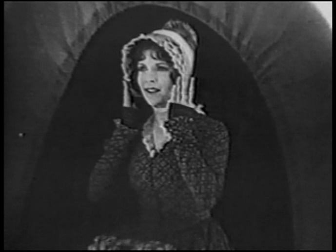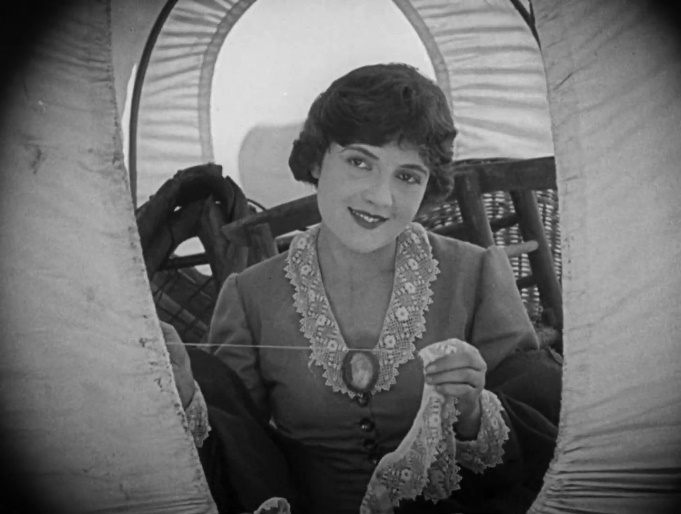 For her part, the analogue for Molly, played by Marie Mosquini, extends the symbolism associated with her character in The Covered Wagon to its heavy-handed conclusion. Knitting on the buckboard of her prairie schooner, framed halo-like by its canopy (Fig. 5), the hypotext’s female lead is introduced in a well-known mid shot modelled on a 1921 painting by W. H. D. Koerner, Madonna of the Prairie—itself widely associated with Cruze’s film and the Emerson Hough story on which it was based. Such an introduction posits Molly as a self-reliant Madonna, the matriarch of the westering civilisation. With the surroundings masked by the white schooner canopy, the pioneers’ mission appears unchallenged. In Two Wagons, Mosquini remains positioned, Madonna of the Prairie-esque on the wagon for the entire first reel, as “proof that you can be a pioneer and still look like something” (Fig. 6).