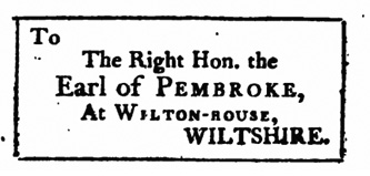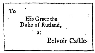 Parus avant les années 1780, ces trois exemples concernent des courriers destinés au comte de Pembroke19, au duc de Rutland20 et au comte de C f—d, que les lecteurs contemporains reconnaissaient fort probablement comme le comte de Chesterfield21, trois aristocrates dont le domaine du deuxième semble suffisamment célèbre pour qu’il ne nécessite pas qu’on précise le comté de Leicestershire dans lequel il se situe, celui du troisième pour qu’on n’ait pas besoin d’en donner le nom. L’adresse complète utilisée dans le premier cas s’explique peut-être, au-delà de la réputation de l’école d’équitation qu’y installa le comte de Pembroke en 1755, par le fait que le manuel connaît plusieurs éditions à Londres mais aussi à Édimbourg. Si le besoin ne se faisait peut-être pas sentir, plus de cinquante ans après l’acte d’Union entre l’écosse et l’Angleterre, de choisir une adresse écossaise, il pouvait paraître préférable d’apporter ces précisions géographiques, pour un manuel d’ambition nationale. Clairement organisés, les éléments d’information sont réduits à l’essentiel, même si la préposition « To » disparaît ensuite, avant la fin du siècle, comme le signale, en 1796, The Correspondent : « Modern refinement has excluded from the directions of letters the preposition ‘To,’ which is now considered a vulgarism »22. Les tenants et aboutissants de ce processus peuvent paraître presque sur-expliqués dans cet ouvrage :